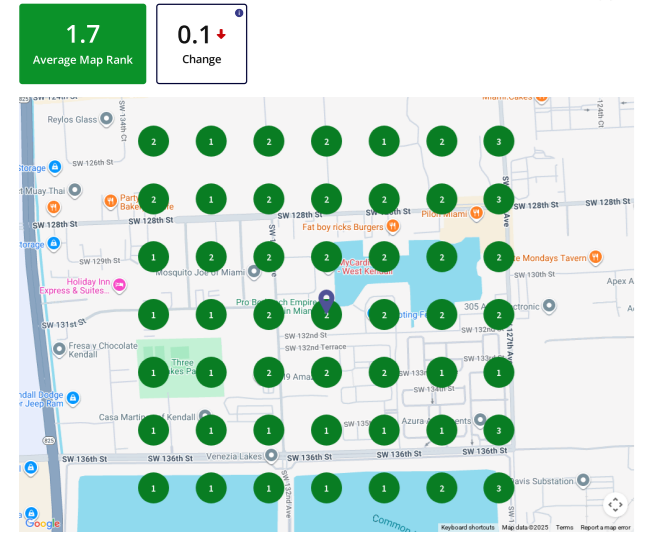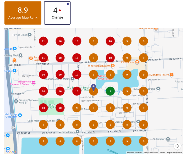 Before & after results for a Miami gym: moving from average map rank of 8.9 to 1.7 in under 6 months.